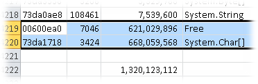 But I digress. One of the really handy commands with sos.dll is the !dumpheap –stat command, this will dump out a summary of object types, the number of those objects and the total amount of RAM consumed by those objects. I dumped these to Excel so I could take a closer look naively expecting to have to do a lot of digging.