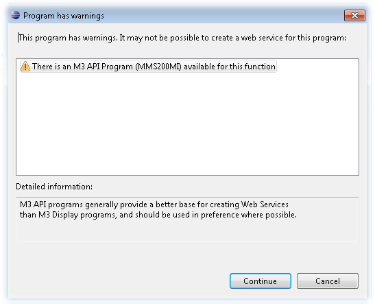 Because there is an API, we get a warning telling us that we should use an API rather than a display program. We will ignore this. As noted previously, please make sure that you are thorough when you are planning and executing your testing when you look at doing upgrades. I suspect that display program web-services are prime candidates to break.