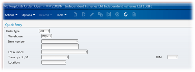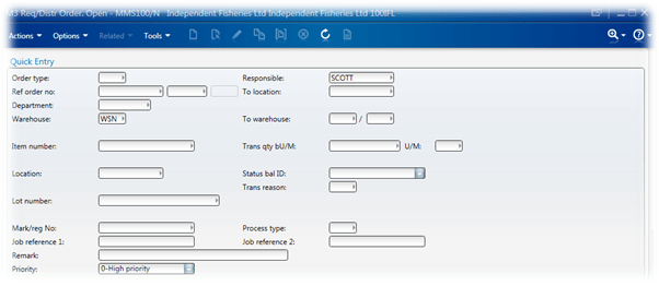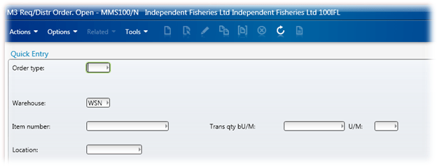 The next problem is that when we enter MMS100/N the focus is in the Order Type field, but we want it in the Item Number (we pre-populate the Order Type and Warehouse fields).