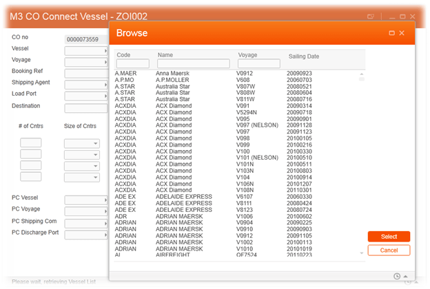 So, in my Vessel Modification I have quite a number of fields that the user can click on to select entries. In the screenshot above we are browsing the list of vessels and voyages and we have the pretty M3 Browse option.