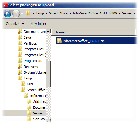 - In LCM -> Admin -> Admin View -> Upload, navigate to the location where you extracted Smart Office, then in to the server directory where you should find InforSmartOffice_10.1.1.zip