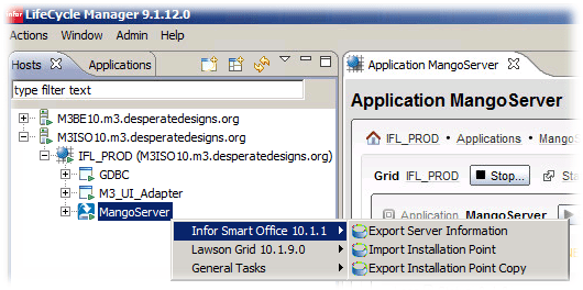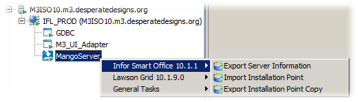 - Export the Installation Point. MangoServer -> Infor Smart Office 10.1.1 -> Export Server Information