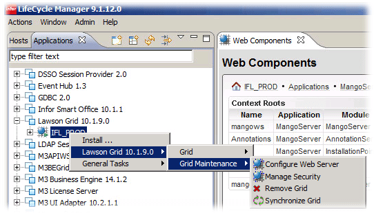 - Install Smart Office, we’ve already uploaded the Smart Office package, now we need to gather some information about the Grid. In LCM -> Applications -> Lawson Grid 10.1.9.0 -> IFL_Prod, Right Click -> Lawson Grid 10.1.9.0 -> Grid -> Grid Management Pages