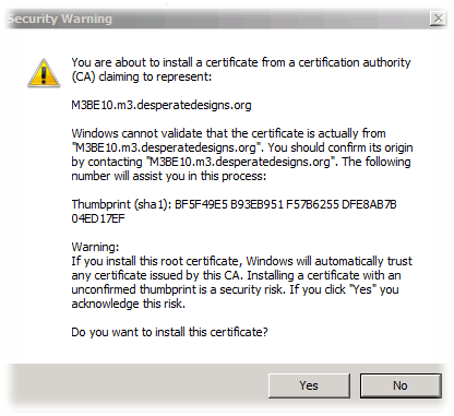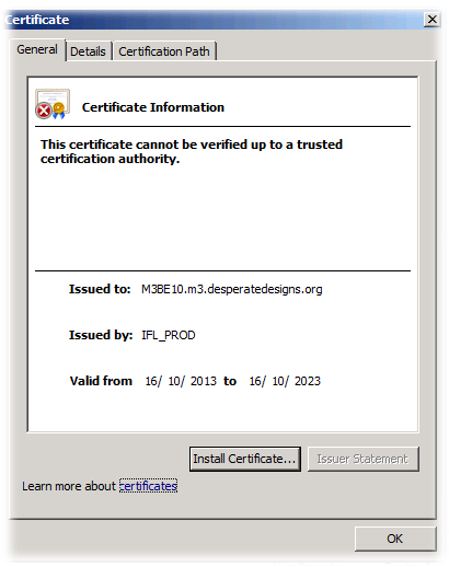 - Give the Self Signed Cert a name, and select an appropriate location (I left it as the default which is the directory for the .jadeconfig file. I left the password blank :-O