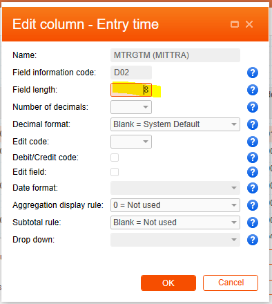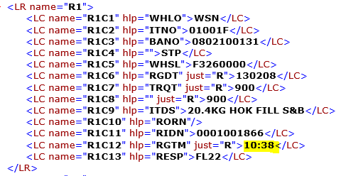 I’ve been working on a project recently where we create a relationship between records in MWS070 and other data without code. One of the key fields is the RGTM, the record time. If you look at RGTM in MWS070 then you’ll notice it is rather helpfully formatted to HH:mm, in the database however it is formatted as HHmmss – this creates a problem when we want to create that relationship.