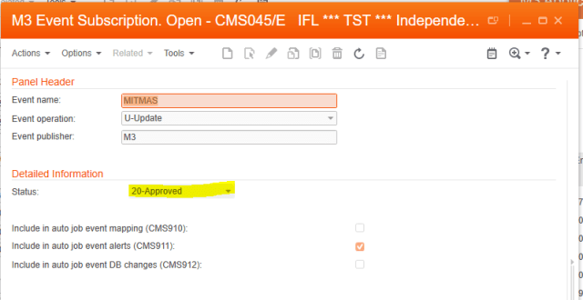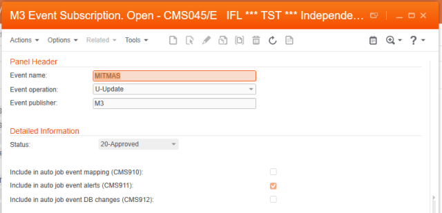 Because we are looking for changes to the MITMAS table, we need to call our event name MITMAS, the event name op. is the type of operation, so U for update. The publisher is M3.