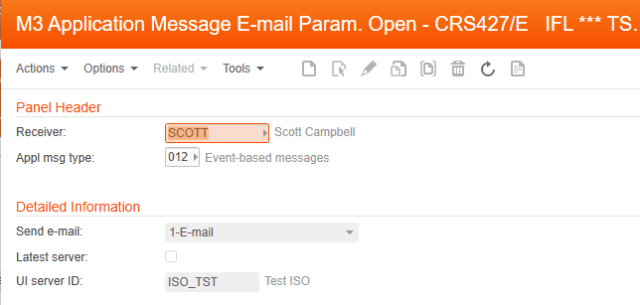 Finally, the Alert Message is the message that we will send in the body of the email and the Receiver is the person who will get the alert. If we set them up in CRS427 then they will be emailed the alert.