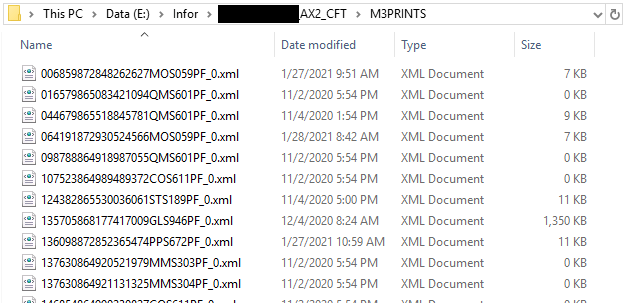 If the MNS204, Save flag is turned on, then when we generate a standard output, be it a document or a report, it will be saved to the M3PRINTS directory. The .xml files will typically end up generating a .pdf, the .csv will typically be transformed in to a .xlsx file.